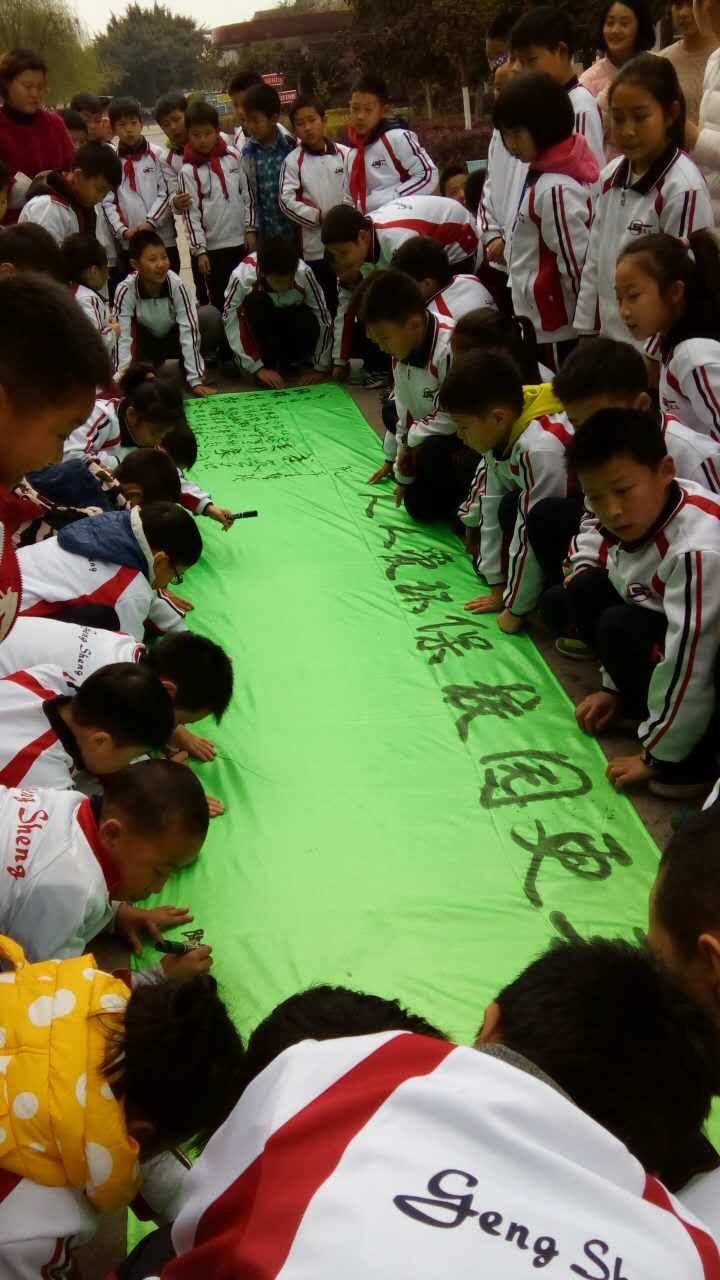 活動分為兩部分。第一部分為百人簽字儀式。同學(xué)們在高大茂盛的綠樹下列隊站好,舉起右手,隨著大隊輔導(dǎo)員朱欣老師的引領(lǐng)莊嚴(yán)宣誓:將垃圾扔進垃圾桶;愛惜糧食不浪費;節(jié)約能源關(guān)水電;愛護花草不亂摘……聲音響徹云霄。接著同學(xué)們拿起手中的墨筆,端端正正在帷幕上簽下自己的大名。大家都是第一次參加這樣神圣的活動,一筆一劃無不透露出認(rèn)真和熱情。